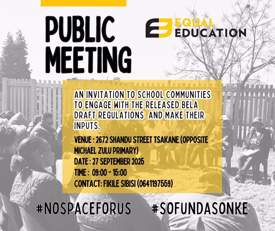 On Saturday, 27 September, Equal Education (EE) with the support of the Equal Education Law Centre (EELC) will host a public meeting in Gauteng, open to all, to discuss the Department of Basic Education’s (DBE) recently released Draft Regulations on the Admission of Learners to Public Schools and the Draft Regulations on Minimum Uniform Norms and Standards for the Capacity of Ordinary Public Schools (the Draft Regulations). These Draft Regulations were released for public comment, and the deadline for submissions ends on 5 October 2025. The Draft Regulations represent a significant milestone for equal and quality education, and the voices of communities must shape what they ultimately look like. They are a direct outcome of years of relentless advocacy, research, and campaigning by EE members alongside EELC to hold the government accountable and call them to action on two pressing issues in South African schools – chronic overcrowding and exclusionary admissions processes.
